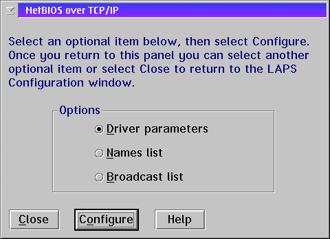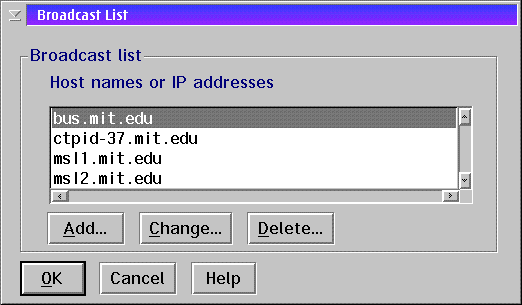 Note that the Add... button in this image is greyed out - this is a known bug in many incarnations of the MPTS configuration program. You will always be able to add at least one NetBios name/hostname pair to this list; however, if your version of MPTS greys out the Add... button after adding the first name, you will have to edit the RFCNAMES.LST file by hand. The default protocol setup for NetBIOS over TCP/IP allows you to specify up to four names. If you can't get those names input via MPTS setup, any text editor can be used (see below). Basically, this is where you tell your machine the IP address of the NetBIOS machine names that you want to access. This figure shows all the addresses as host names, but you can equally well use IP addresses like 18.178.0.30. The limit of four is defined in the protocol setup. If you really need more, then it's time to agitate for a NetBIOS nameserver. You may be able to use a WINS server, but I don't know anyone yet who has. (See RoknRob's web site for more information on WINS configuration.) You also need to configure the Broadcast List. When you select that radio button and then click on Configure, you get: