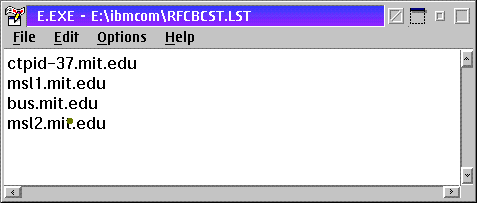 The NetBIOS protocol, as a non-routable protocol, only knows how to achieve certain tasks by basically sending a message to every machine it can find (broadcasting). As you might imagine, this is something of a problem for big networks, hence the need for nameservers. You need to put the same machines in this list that you put in the names list. Again, either hostnames or IP addresses are acceptable. After you exit from this program, you may be told to reboot. That isn't necessary if all you've done is modify these two lists. Just go to the \IBMCOM directory and run RFCADDR from the command line: this registers the lists with the currently running peer daemon, so you're all set. You can also edit RFCNAMES.LST and RFCBCST.LST with any text editor. The file format is straightforward: RFCNAMES.LST is composed of records that pair a NetBIOS name, inside of double quotes, with an IP hostname, and RFCBCST is just a list of hostnames: