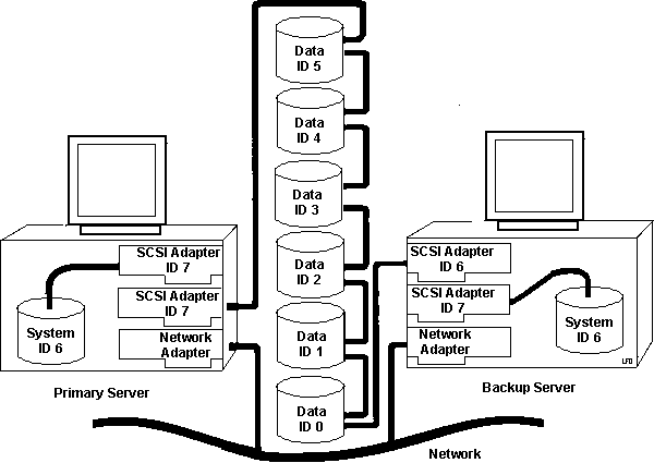 In this example, one SCSI adapter in each computer is attached to the shared set of six 3510 SCSI Storage Enclosures. The other SCSI controller is attached to the system hard disk. NOTE the SCSI IDs for the shared disk set- the two SCSI controllers attached to the disk set have different SCSI IDs (ID 7 and ID 6). Also, the IDs for each SCSI device involved with this disk set range from 0 to 7. NO DUPLICATE IDs ARE ALLOWED!!! My question- Do you only terminate the adapters? Sure can't terminate any of the drives.. Backup Server Using