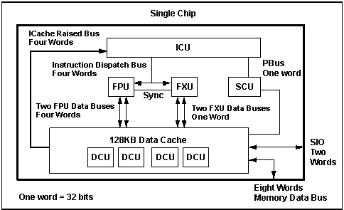 The P2SC can issue and execute six instructions per cycle, two of which can be floating-point multiply-add (FMA) instructions. It supports register renaming and out-of-order execution, although only for floating-point instructions. With dual branch units, the P2SC can also execute two branches per cycle, although only one can be taken, while the other is put on hold. The data cache is triple-clocked to handle two CPU accesses (load or store) plus a cache refill (write to cache from main memory). Thus, this part of the chip operates at 500 MHz.
