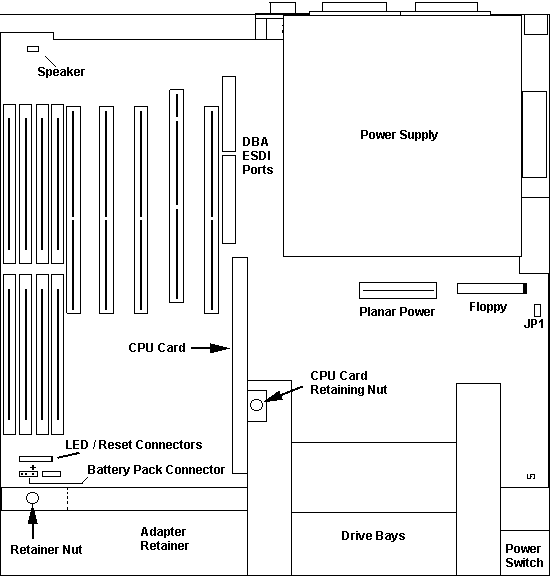 As you'd expect from a bunch of former IBM'ers, it's fairly easy. Pull all adapters. Unplug the speaker, LED/Reset Switch Header, battery header, pull the cpu card, remove the floppy and power plugs, pull the edgecard off the DBA ESDI drive (leave the tape connector headers in the board sockets).