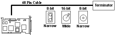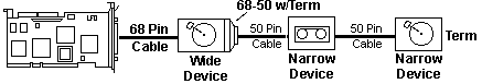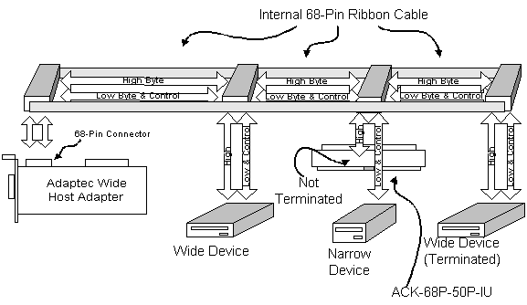 Connecting both 50 pin (i.e., 8-bit) and 68 pin (i.e., 16-bit) devices to an IBM wide host adapter is a straight-forward process once the following basics are understood: