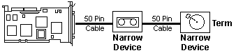 The following are examples of how to connect a SCSI bus with wide and narrow devices. These examples refer to both the Corvette and Corvette Turbo. They MIGHT possibly apply to the Cheetah and Passplay adapters. The SCSI adapter automatically terminates it's end of the bus, but you must manually set termination of the "High Data Byte" - IF - a Wide device is attached to the 50 pin edgecard - OR - for some odd reason, you have a wide device on a 50 pin cable attached to the Wide internal conductor.