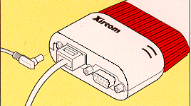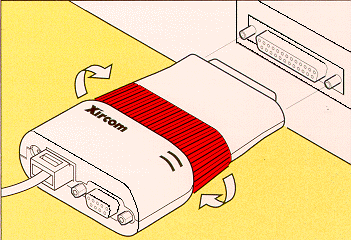 With system OFF, plug Pocket adapter into parallel port. The Xircom logo and LEDs must be on top. Rotate the red band (tractor grip) clockwise until the screws are secure. When the screws are tight, the band will "click" as you rotate it.