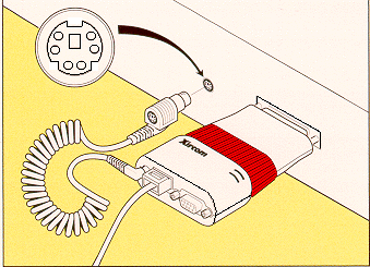 Power system OFF. Ensure Pocket Adapter is attached to parallel port. Insert L shaped plug into Pocket Adapter. Plug pass through power connector into PS/2 port.  If you need to, plug your mouse into the pass-through connector.