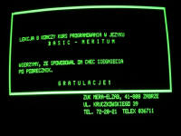 This course was a well-known 8-lesson course for TRS-80 (accessible in TOSEC collection) translated to Polish and ported to Meritum (graphing routine is a little different, delays are replaced by keypresses). The first lesson even had the starting rocket animation! It came on 4 cassettes. Unfortunately I got only two, with one side recorded with piano music. I recovered only lessons 4, 7 and 8. Each lesson consists of 3 or 4 parts, which are separate BASIC programs.