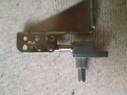 Let's look at the photo on the right. There's an aluminium part with bigger bolt. This bolt comes to the lower part of laptop and is secured by screw on the bottom. The tab on the right of this part has a hole, in which a screw comes securing silverish plastic cover in place.