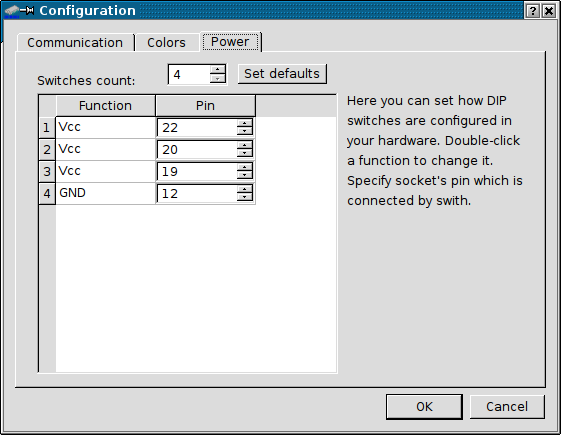 This tab is very important. As you've seen by looking at IC tester hardware, Tester's board has 4 DIP switches connected to power or ground, but it can support more with user settings. For example if you check many chips in 24-pin casings, and they need power connected to pin 24, you can use 5th DIP to connect power to pin 24. This window allows to define these additional switches and they're taken to account when suggesting you power configuration before test. Double-click on a selected DIP switch function to change what is connected to it: Power (Vcc) or ground (GND). There may be "empty" DIP switch too, it's just disconnected so it's only drawn as present, but not used. Then you have to specify socket's pin which is connected with this DIP switch. You can always revert to default setting by pressing Set defaults button.