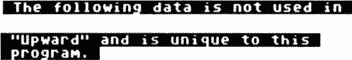 Done? Okay, save the file (as UPWARD) through the editor before compiling! Also, make sure you check your typing with "D:CHECK in Action!" (issue 44). This is because, if you made a mistake, you don't want the whole program eaten. Half the game is machine language, and, if you mistyped something, the computer will acquire a bad case of schizophrenia. So save the silly thing!