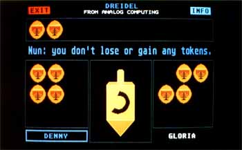 The player to begin is chosen at random by the computer. That player then spins the dreidel by clicking the mouse in the dreidel area. It will spin a random number of times and then fall over on one side. The instructions area will announce the outcome of the spin. If the spin is a gimmel or a heh, the player moves tokens from the pot to his own pile. This is done by clicking the mouse directly on the tokens in the pot; they are then automatically moved to the current player's pile. If the spin results in a nun, the player does nothing. If the spin is a shin, the player must move two tokens from his own pile to the pot.