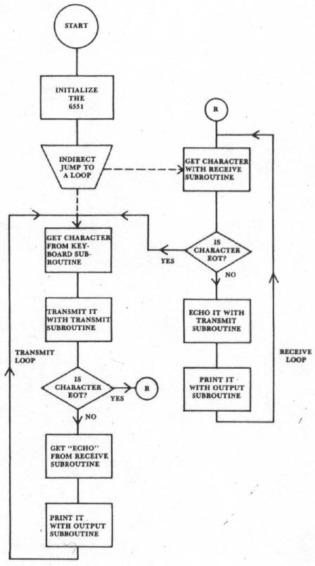 Study the flowchart and the program listing. The program begins by intitializing the 6551. An eight-bit word (TTY compatible) is used, with the parity check disabled, and one stop bit is sent. The Baud rate chosen here is 110, but it should be possible to go to 300 Baud. Both participants must have the same rate. Next, the program jumps to either the receive loop or the transmit loop depending on the vector loaded into $0000 and $0001. This was a crude way to start, but it should work.