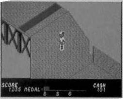 To start, you have a time limit in which you must skate from the main park to one of the events, If you don't beat the clock, a swarm of killer bees attacks you. On the way, you can pick up loose dollar bills by skating over them and then use the money to buy new equipment like shoes, pads, helmets, and better skateboards. With better equipment, you become a better skater. If you get lost, you simply skate to an M on the course, and a map pops up. To accomplish spins, jumps, slides, and headstands, you press the fire button and move the joystick in various combinations.