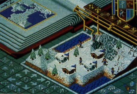 While all of this is going on, the evil deity is building up his own population. However, you have a few tools that make life harder for him. Earthquakes, floods, and volcanoes destroy the evil god's carefully cultivated lands. Change parts of his home territory into a swamp and watch his walkers disappear into the ground. Transform your walkers' leader into a knight who burns and pillages enemy villages. You have to keep the evil deity's land from developing, or his population will grow more quickly than yours, and yours will be overwhelmed.