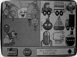 Kids can choose from three activities: Picture, Puzzle, and Story. The Picture option lets children create a series of storybook pictures. They can add a background, a person, a moving object, and a building to each scene. They can print the picture or use the Keep option to save the picture in the library on the program disk.