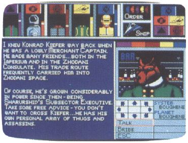 Amazingly detailed EGA graphics enhance your party's exploration of the richly diverse planets, each defined by numerous distinguishing characteristics. For instance, you might discover a huge water world with a poisonous atmosphere and a small population with a prestellar technology—but no starport where you might land. This degree of detail is evident throughout the game, from weapons variety to vehicle types to the colorful characters you're likely to meet during your travels.