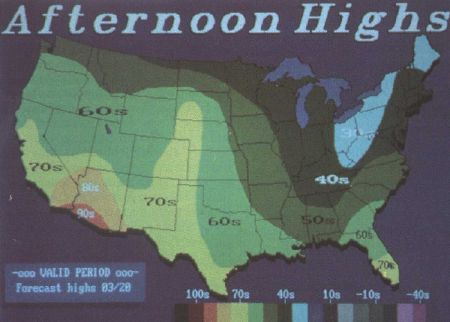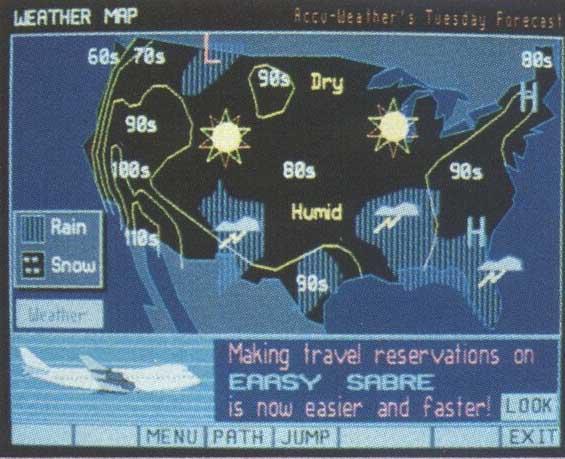 Prodigy, another major player in telecommunications, also has a weather section, which was recently improved. It now has three national weather maps, one showing weather for the current day, another showing fronts and iso-bars for the current day, and the third showing weather for the next day. Seven regional weather maps have also been added. City weather reports have been expanded to include temperature in Fahrenheit and Centigrade, winds, air quality, a three-day forecast, and the times of sunrise and sunset. The number of cities has been expanded to 235 domestic and 100 frequent international travel destinations. In the major metro-politan areas, there are reports for the cities in the region. And the outdoor reports have been expanded to include reports on beach/boating, skiing, and foliage reports.