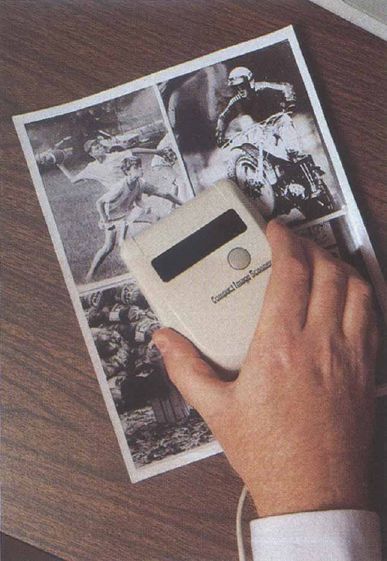 A hand scanner is not used to scan hands, as one person suggested, though it could be used for that. It's called a hand scanner because it's small enough to fit in a person's hand. Most professional-level scanning units look like photocopiers or fax machines. They generally take up a lot of desk space and scan whole pages at a time. A hand scanner is about twice as big as a mouse. It's perfect for use with the 64 because it will only scan an image about four inches wide and a few inches high—which quickly fills all available memory in the 64. Larger images can be scanned by reducing the scanner's sensitivity, but these images are usually unrecognizable.
