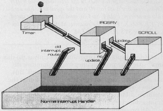 If IRQSRV decides not to update the display, it jumps to the computer's normal interrupt handler, whose address is stored in OLDIRQ. If IRQSRV decides to update the display, it calls SCROLL before returning control to the machine's normal procedures.