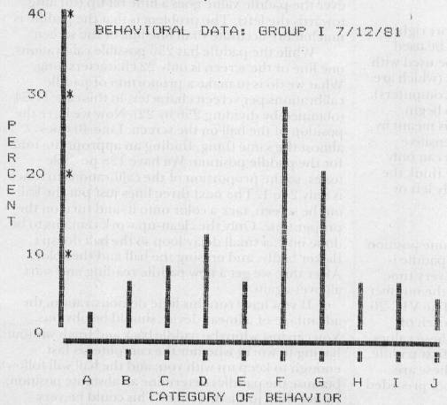 The data from my behavioral experiments (and many others) are expressed in a relative frequency distribution: 10% of the subjects exhibited behavior X, 20% exhibited behavior Y, etc. Typically, these data are represented in tabular form. When you have multiple experimental conditions and, thus, many tables, it is difficult to see trends or changes in the data. So, a bar graph, or histogram (see Figure 1) is often used instead. It is much easier to visually scan a series of histograms and detect changes in the data than with many tables. But how could I convert my frequency data into a histogram quickly and simply and have it printed out on my MX-80? That is where Screen Pro came to the rescue.