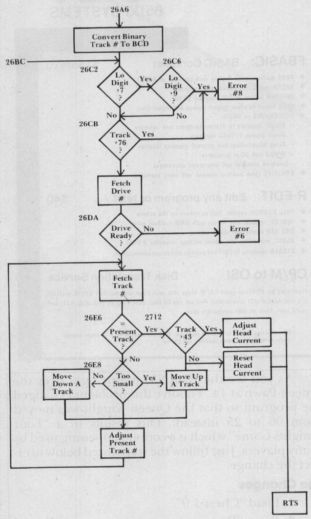 26BC Check for track 0-76 BCD, check for drive ready, move disk head to track, adjust head current, and if an error occurs, abort and send an error message via 2A4B.