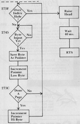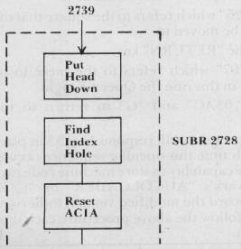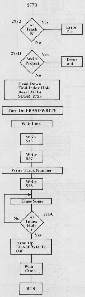 The sequence beginning at $2728 may be viewed as the standard startup to read or write a track or sector. It puts the head on the disk, finds the index hole, then initializes the disk data ACIA.