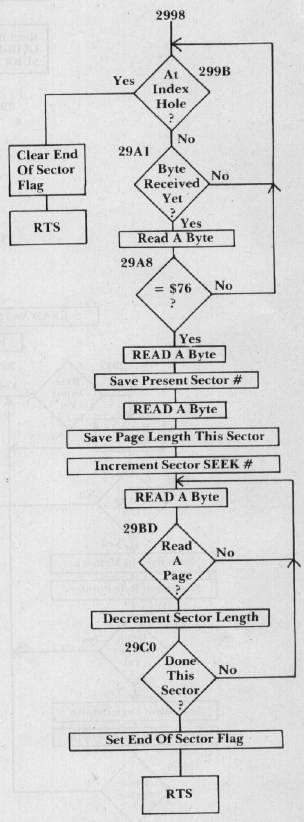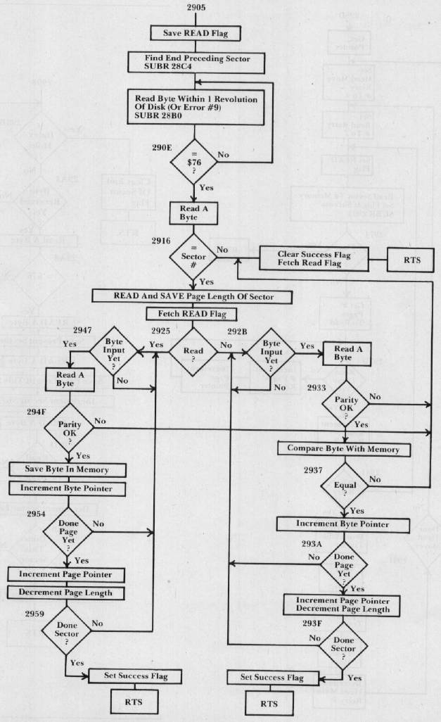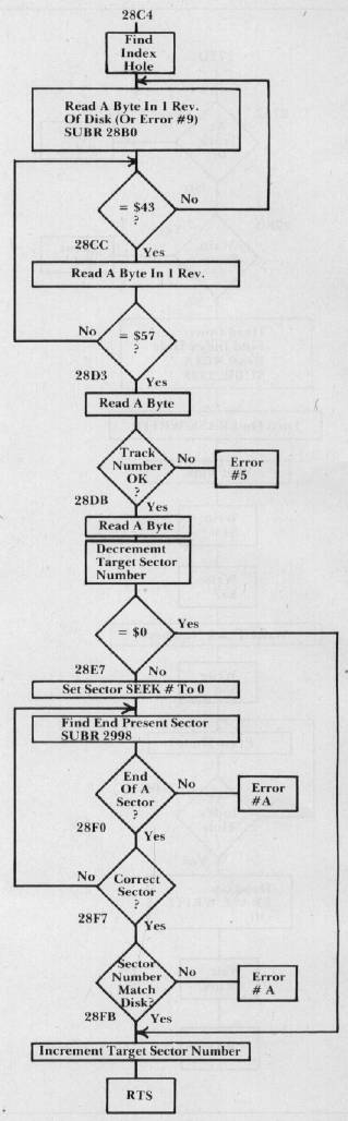 Both read and save routines use the sector seeking routine at $28C4 which, in turn, calls $2998. Further, they both use a dual purpose routine at $2905. If the accumulator is zero on entry, this routine reads to memory. If it is nonzero, then the routine compares with memory. The actual read and compare loops within this routine are separate. With 8&inch; floppies and a 1 MHZ clock, the 6502 is not fast enough to get from one disk byte to the next if the read and compare loops are combined into one. As it stands, the compare loop just barely returns in time for the next comparison. With a 2 MHZ clock there is plenty of time.