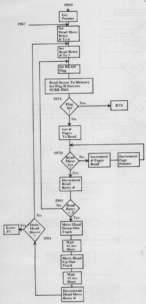 The major "Read a Sector" routine is $295D. It uses data in $265-E-$2662. Again OS65D may enter this routine at $2967 if the load vector at $FE, $FF has been set. This program tries to read a sector seven times. The only error check (other than sector seek errors which abort immediately) is a parity check for each byte. If, after seven tries, a read still fails, then the head is moved down then up one track. This whole process may be repeated up to four times before Error #1 is reported. This error also seems to be very rare.