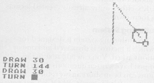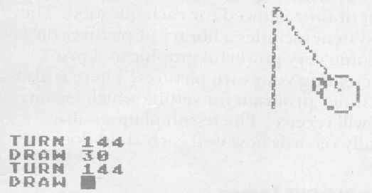 The idea behind this program is that the turtle is first drawn on the screen. Once the user indicates how much to draw or turn (since these commands appear alternately), the turtle is then erased (by drawing it again with the ERASE pen), a line is drawn, or the turtle is turned, and the picture of the turtle is drawn in its new location with the yellow pen.