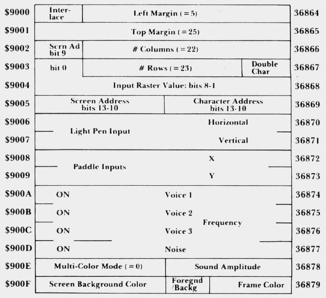 Beginners often don't realize that memory addresses are used for more than memory storage. In the VIC computer, addresses 36864 to 36879 may be PEEKed or POKEd. These locations are not used for memory – they hold controlling information for the VIC chip. We're going to look through those addresses, experimenting as we go. We may learn some new things about our computer.