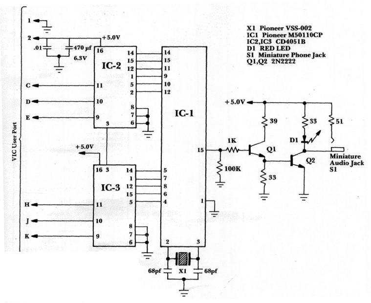 The CD4051s are switched by the output from the 6522 VIA chip in the VIC computer by way of the User Port terminals C thru K. The transistors Q1 and Q2 buffer IC-1, provide pulse inversion and drive for the 30 feet of audio cable connected to the LaserDisc player. The LED, D1, also blinks out the coded pulse string indicating that the data pulse chains are being sent by the Adapter.