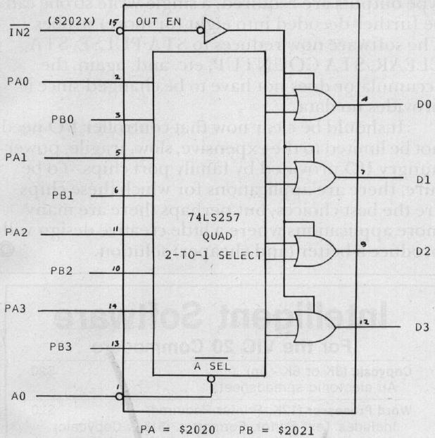 A suitable TTL byte input port would be any of the octal three-state buffer chips. The 74LS244 and 81LS97 are examples, A quick count will show that 20 pins are required for this function. A three-state octal latch like the 74LS373 or 74LS374 can provide a latched byte input port. While a pair of 20-pin chips could be used to provide a pair of 8-bit input ports, a pair of ports can be realized with two 16-pin chips. Figure 2 shows a pair of 4-bit input ports, realized with a single 74LS257 three-state quad 2-to-l select chip. (Two chips will give two 8-bit wide ports.) An address bit, usually A0, is used to select between the two ports. A pair of these chips takes typically 20 mA, much less than a pair of ports from a 6522.