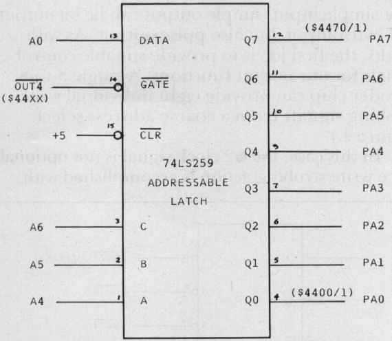 Byte style output ports can simply be any of the numerous octal latches in 20-pin packages. While the board space requirement for a pair of such ports is about the same as for a 6522, the power is somewhat less. As with input functions, most designers use byte-style output ports to achieve single bit outputs. The differences are resolved with software. To turn off (or on) a particular bit, without changing other bits in a port, the output port (or status) is loaded, an appropriate AND (or OR) mask used, and the altered data is written to the port. This takes three instructions and eight bytes. However, if a port with individually addressable bits is used, any arbitrary bit can be turned on or off with a single three byte instruction, and without changing the accumulator. The port itself is shown in Figure 5, and uses the not-well-known 74LS259 addressable latch chip. This chip has three address lines to select one of eight output bits. A single data line is used to apply the one or zero to set or clear the selected bit.