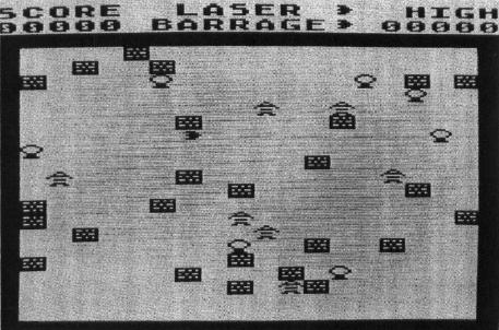 The Atari version of Laser Barrage requires 16K and a joystick. When you RUN the program for the first time, you'll see the message "PLEASE WAIT", and if you turn up your TV volume control, you'll hear a series of random tones as the custom character set for the game is initialized.