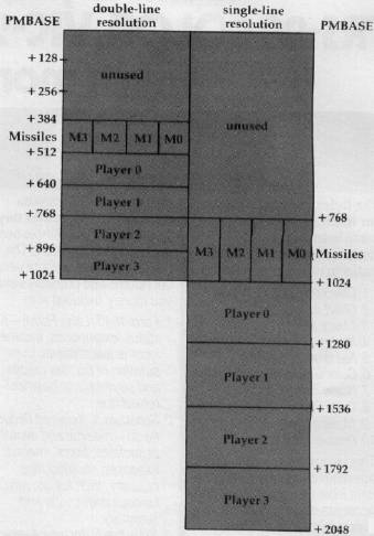 There are two types of P/M graphics: single and double line resolution. Single line resolution requires 2K of RAM: 256 bytes for each player (4 × 256 = 1K), 256 bytes for the missiles, and 768 unused bytes. Single line resolution, which has the vertical "fineness" of GRAPHICS 8 pixels, must start its memory on a 2K boundary (divisible by eight pages).