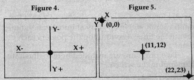 • Cartesian Coordinates. The Cartesian Coordinate system is the common x - y coordinate system that is widely used in plotting charts and graphs. The x coordinate represents an imaginary horizontal plane, the y a vertical plane (refer to Figure 4). Positions are plotted by indicating their x and y coordinates (x,y). That is, you can locate anything by giving a horizontal and vertical number. It's like the way you can locate a particular street on a city map by looking for it within the square called "F-5" or "C-2." In the article "VIC Bitmapping," x coordinate points begin at the left of the screen, y coordinate points begin at the top of the screen (see Figure 5). Coordinate 0,0 thereby becomes what computerists call the HOME position, the upper left corner of the screen. Screen positions are plotted by raising or lowering the x and y coordinates. Figure 5 illustrates plotted examples where the x,y coordinates are 11,12 (middle of the screen), and 22,23 (lower righthand corner).
