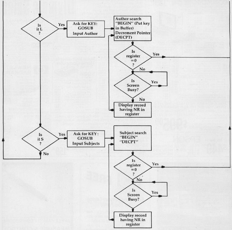 In the accompanying flowchart, I have illustrated the design for my author-subject file of books and articles. How you want your data displayed, what you want printed, and what you want on the screen will depend on your individual situation. Some people want a printout of their input as well. It is also easier for some people to proofread text on paper than on a screen, so customize it for your needs. Your requirements will differ from mine, so your flowchart will be different, too. However, you probably should use subroutines in a modular fashion.