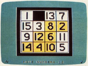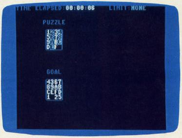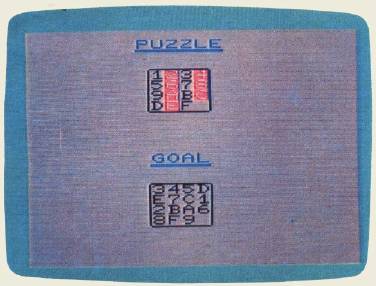 Move the lettered or numbered blocks around the game board with a joystick or the keyboard (E, S, D, and X keys). You actually have a choice of moving either the free space (hole) or the labeled blocks. The game is initially set to move the free space, but by pressing I (note the appearance of the left-right arrow symbol in the lower-left corner of the screen), you can move the labeled blocks.