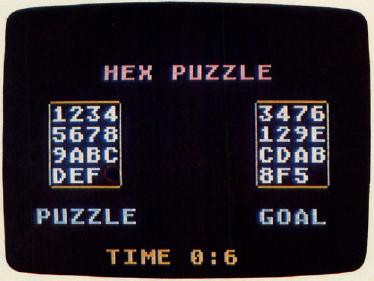 If you succeed in getting the squares in the goal order, the message YOU WIN! appears on the screen, accompanied by a short tune and the elapsed time. If the time runs out before you are finished, you'll hear an unpleasant sound. If you want to stop the game, press RETURN and the screen will display the elapsed time. You can then restart the game, either as you left it or reset, by hitting RETURN a second time.