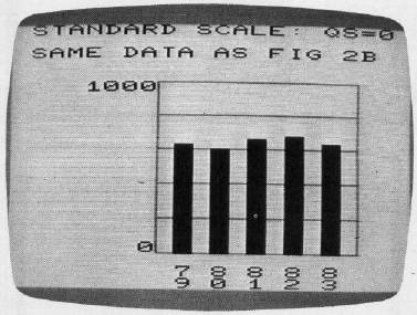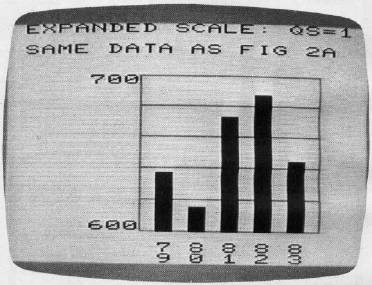 The prescaling options, QS = 3, 4, and 5, are the same as QS = 0, 1, and 2, except nothing is put on the screen. But the maximum value (QX), minimum value (QN), scale factor (QZ), upper-scale label (QU), and lower-scale label (QD) are all computed and made available to the main program. Our final program uses this capability to combine Figures 1 and 2 into one graph. It's possible to make some very effective displays with these options, without a lot of programming.