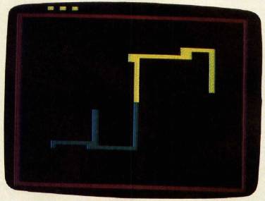 In "Barrier Battle," you must maneuver your barrier in an effort to contain jour opponent. The fire button on the joystick (or the space bar for the versions using keyboard) allow. you to leave spaces (holes) within your barrier Clever use of this, feature lets you corner your opponent and still leave yourself a means of escape You can create a maximum of five holes in each game.
