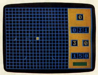 To stop the incoming wave of enemy missiles, release an antimissile from your base (centered in the radar grid) by pressing the fire button on joystick 1. Use the joystick to direct the antimissile toward the nearest incoming missile as shown on the radar screen. Once you have picked off the incoming missile, you are ready to release another antimissile from your base. Be sure to keep your antimissiles on the radar grid.