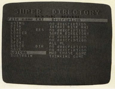 "Super Directory" is an easy-to-use menu program for selecting and running BASIC programs from disk. In addition, it alleviates the limitations of Atari's eight-character filename by storing a 20-character description of each filename.