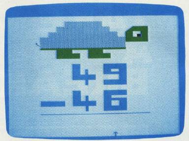 In Program 1, once the necessary information is entered, the turtle's image is POKEd onto the screen. The two numbers used in the problem are chosen in lines 305, 315, and 1070. The numbers are then displayed on the screen, each digit being four regular characters high and three wide. The large character set is created in a series of subroutines in lines 500–990.
