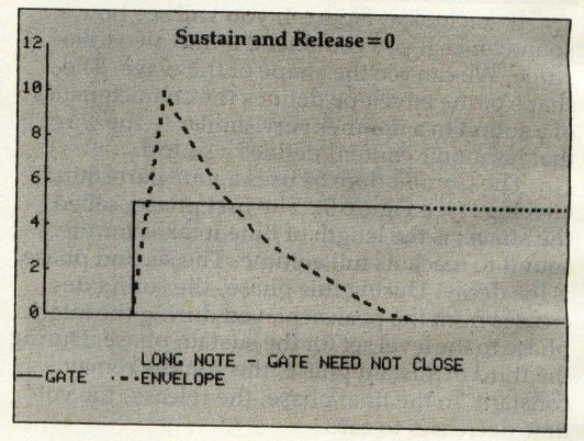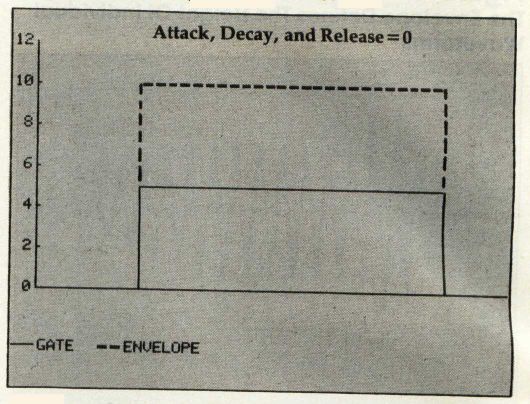 To turn the sound on in the SID chip, you must open the gate. As soon as the gate is opened, the sound level begins to rise at a rate determined by the attack. Once the peak level is reached, the sound begins to decline to the level set for the sustain. The rate at which it declines is defined by the decay.