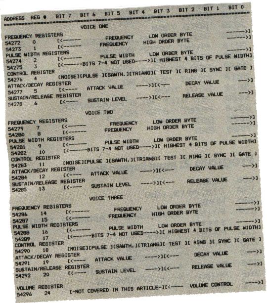 The SID is really a quite amazing chip. It takes just 29 registers in your computer's memory, and with those 29 registers (actually you won't even use them all) you can produce a great variety of sounds. We'll call them registers, but they're actually a row of 29 bytes of memory.