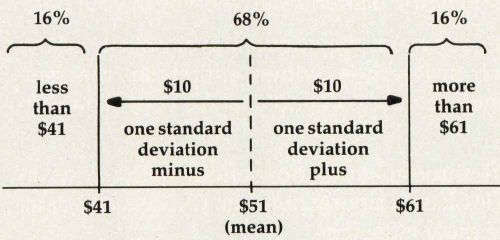 Combining one standard deviation and the mean (or average) amount spent, we find that two-thirds of the weeks you spend between $41 and $61 at the grocery store. One-sixth of the time you spend less than $41; one-sixth of your bills are more than $61. So, if you budget $61 for groceries, you'll have enough 84 percent of the time.