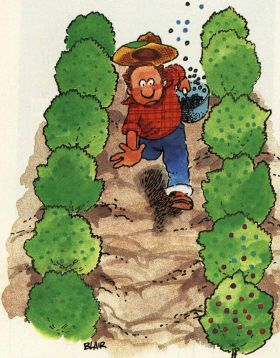 Now you can plant the seeds by moving your farmer while holding down the fire button of your joystick. The seeds are small, long, and light green.