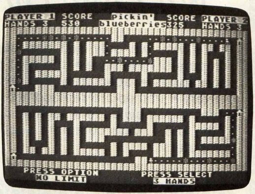 Blueberries can be restarted at any time while the program is running by pressing START (on the Atari). This, however, puts you in the option-selecting mode. Press START again to begin game play.