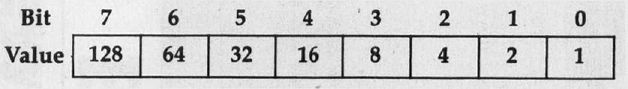 Each byte is composed of eight bits. Each of the eight bits is like a light switch: It can be either on (1) or off (0). Each of the eight bits has its own value (see illustration below).