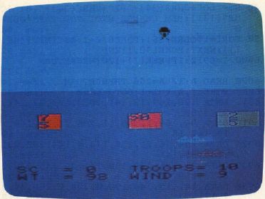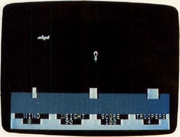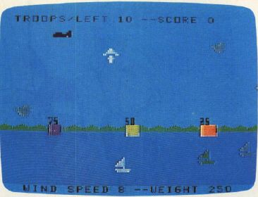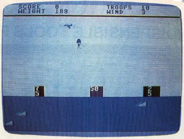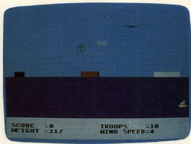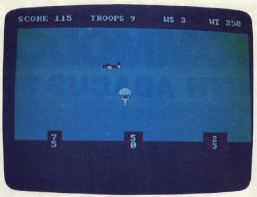 The various versions of Paratrooper differ slightly, but the concept is the same. Your plane continuously flies across the screen at an altitude which changes randomly for each jump. The paratroopers' weights and the wind speed change for each jump, too. All this information is displayed on the screen. You have ten paratroopers: ten chances for glory, or ten chances for dripping disaster. To drop a trooper, press any key (on the TI-99/4A, press Q or the fire button on joystick 1). The three landing pads are worth 25, 50, and 75 points, depending on their size.